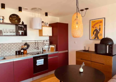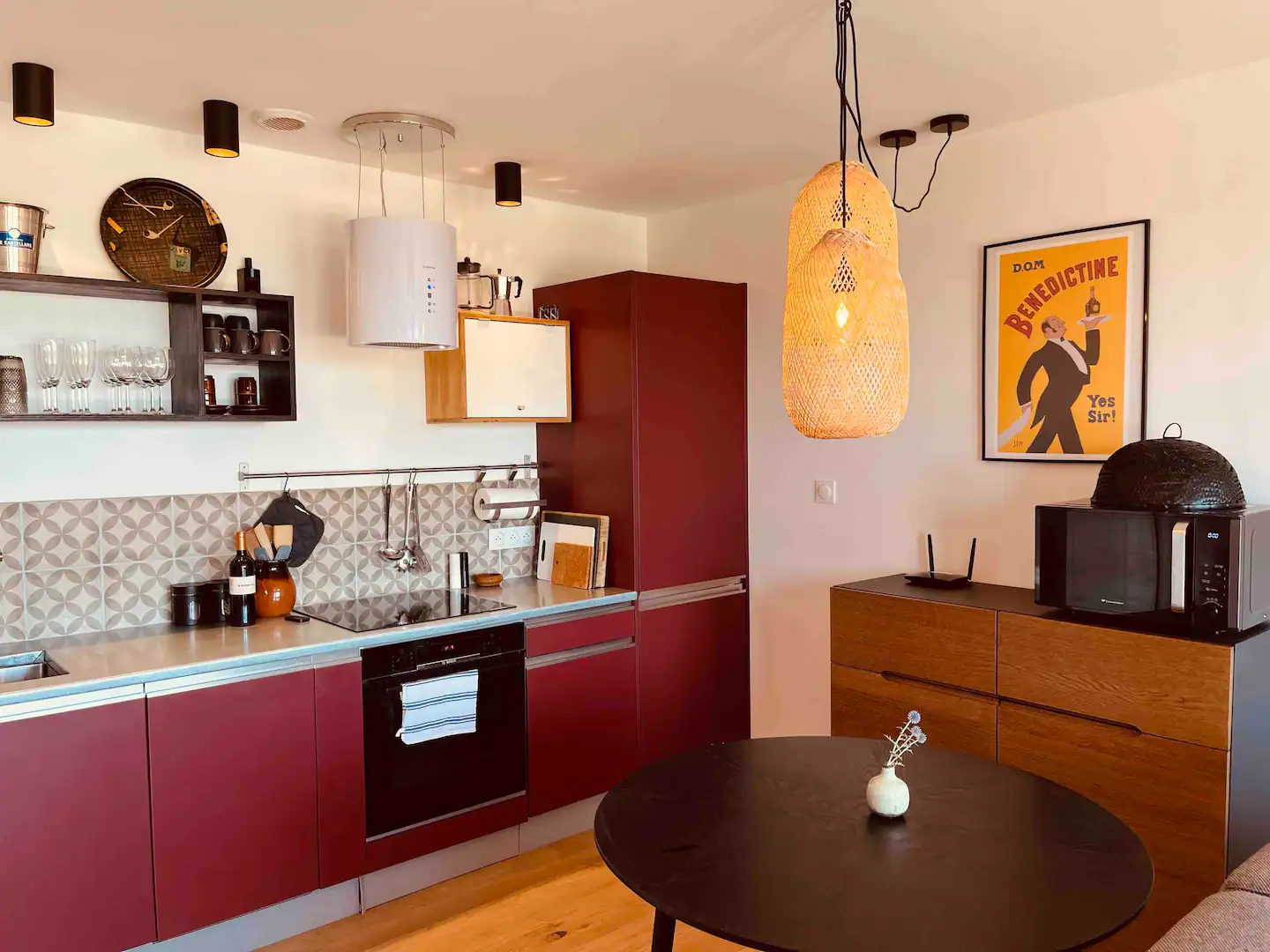 Equipped with Bosch oven, induction hob, dishwasher, full size fridge freezer and microwave. Cooking pans and utensils, plates, cutlery and serving dishes are supplied.
