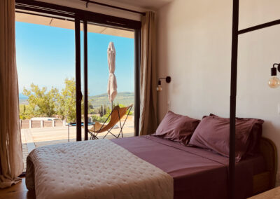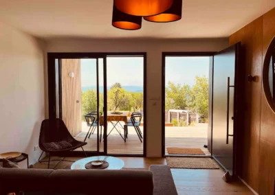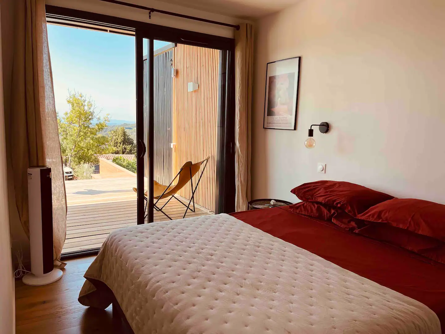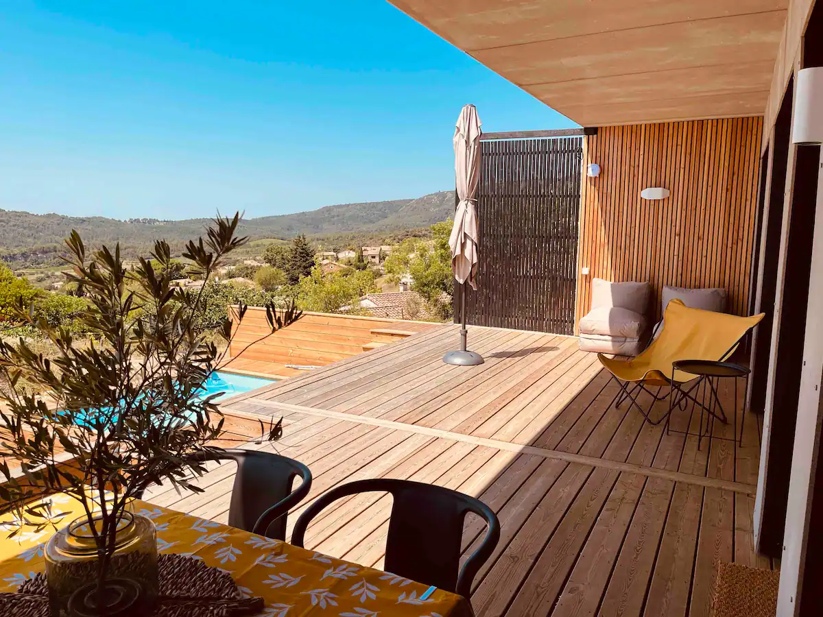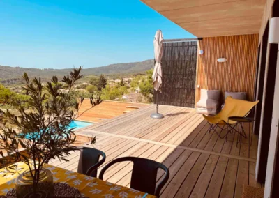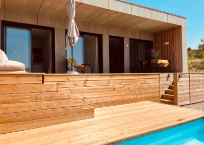 The lounge and two double bedrooms open onto the large wooden terrace, via full height south-facing sliding doors. Sun loungers, sun shade, dining table and chairs are arranged on the terrace levels. The terrace has room for outside dining under the cover of the porch. Loungers and outdoor chairs offer opportunities to relax beside the pool, and there is a barbecue in front of the house. There is parking for several cars close to the house.